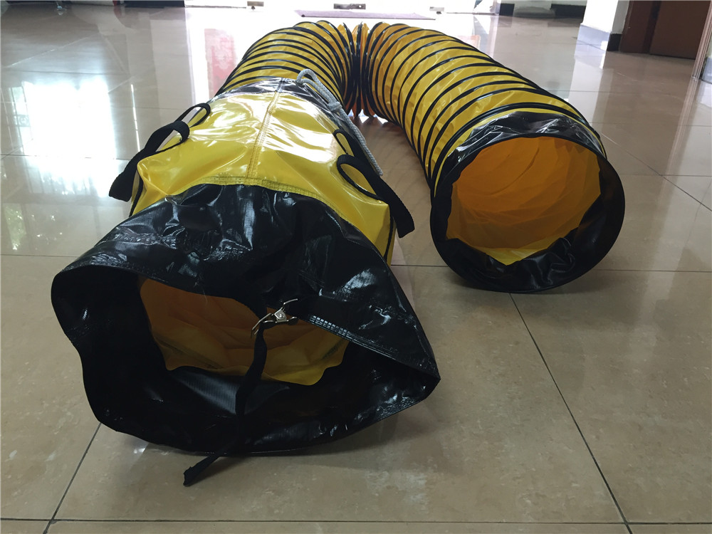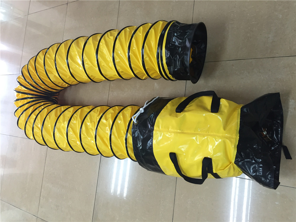 风管主要由三种材料组成,钢线, 阻燃的PVC夹网布, PVC胶条。 用PVC胶条包裹着的钢线作为风管的骨架,风管的管身是PVC夹网布,管身处每隔一米有一个金属吊环,用于固定风管。