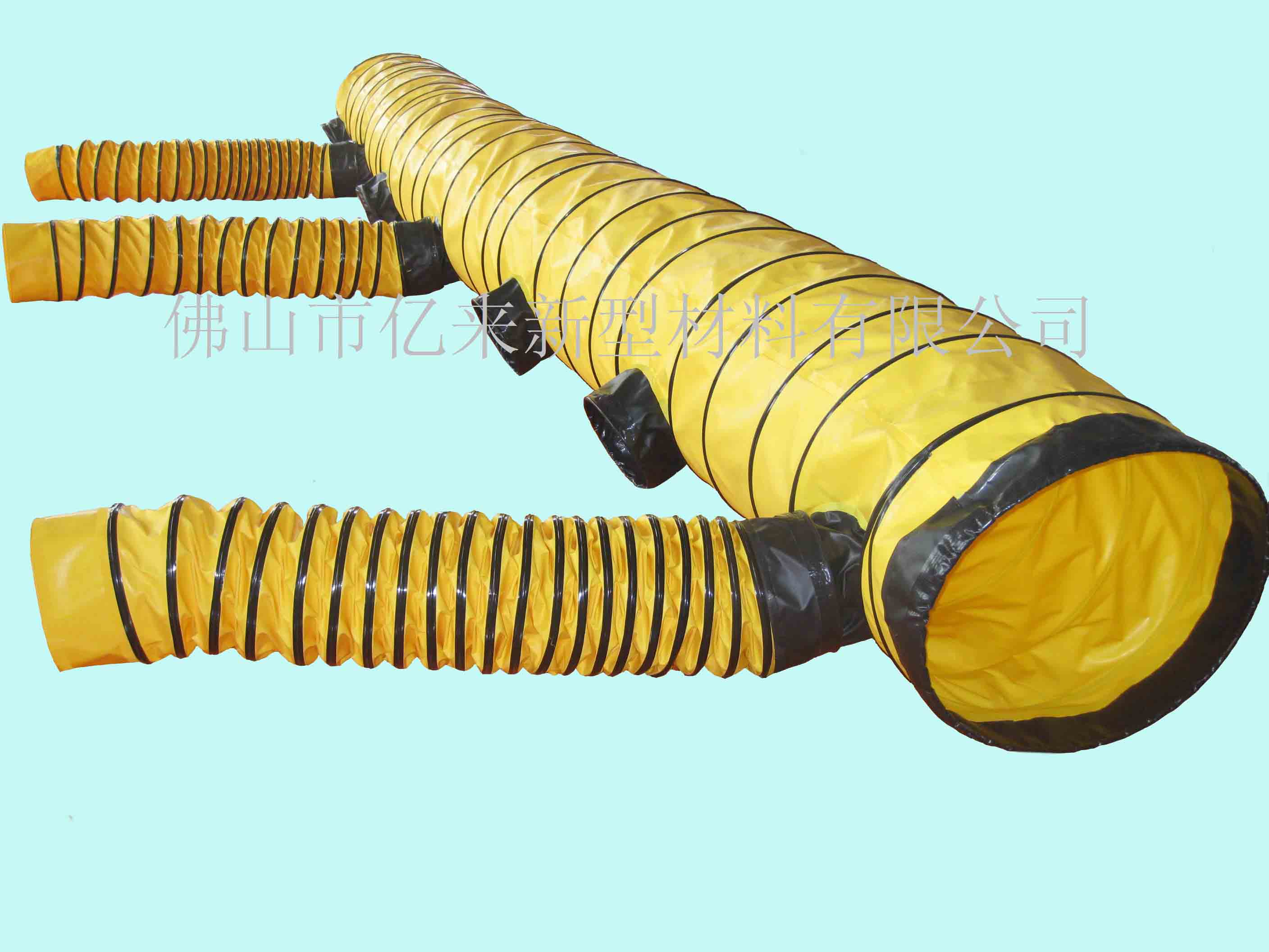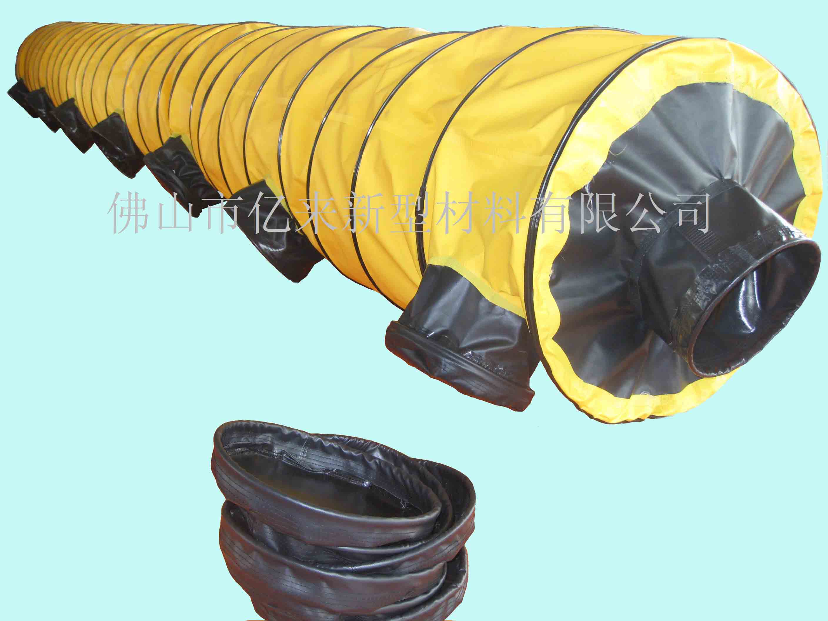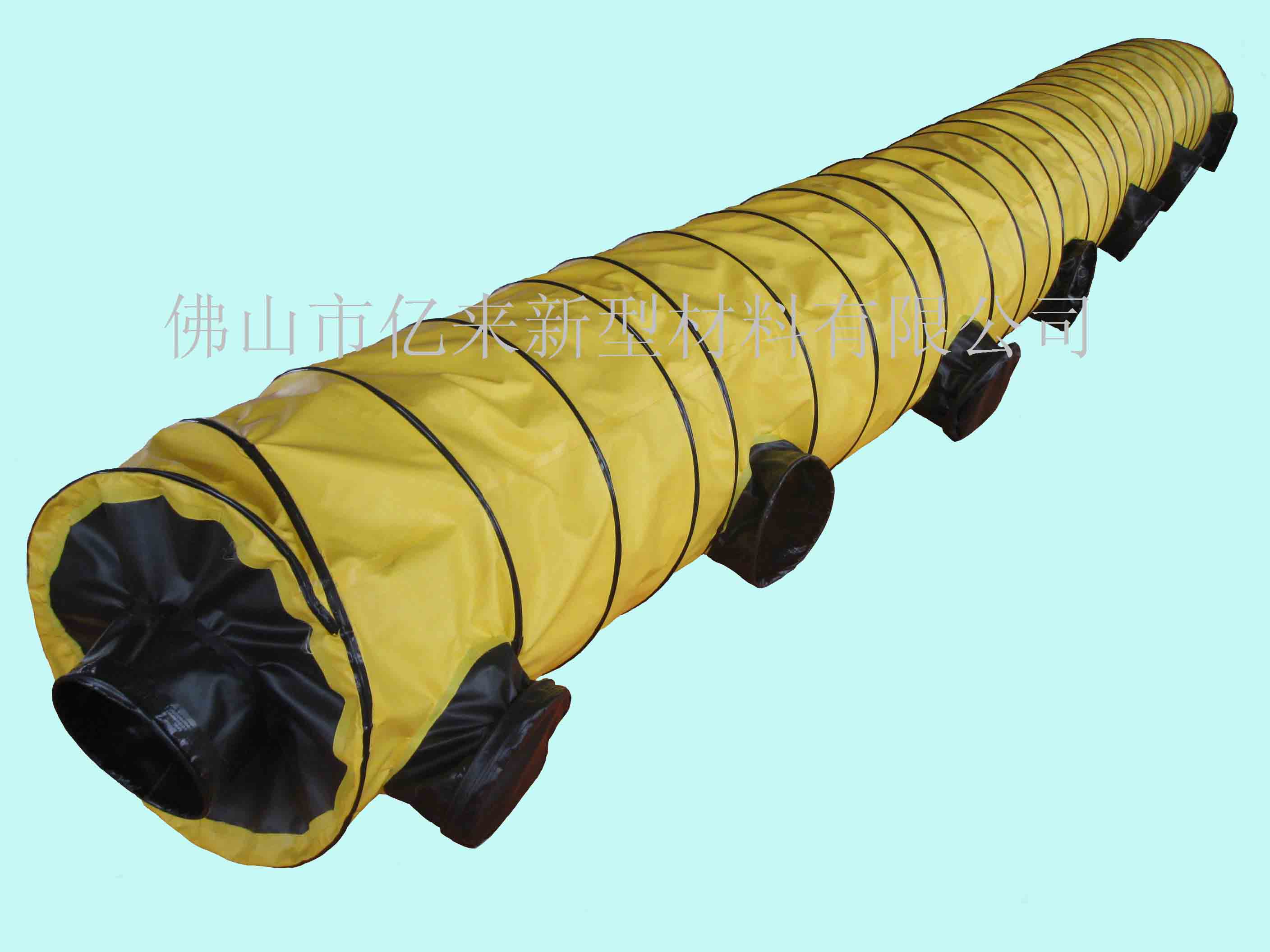 风管主要由三种材料组成,钢线, 阻燃的PVC夹网布, PVC胶条。 用PVC胶条包裹着的钢线作为风管的骨架,风管的管身是PVC夹网布,管身处每隔一米有一个金属吊环,用于固定风管。