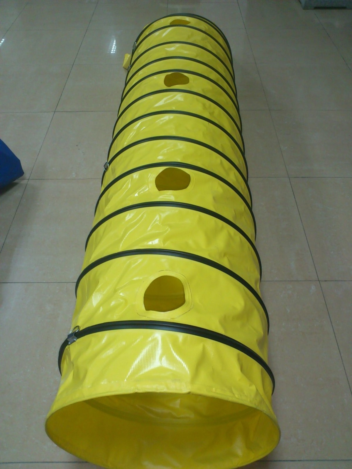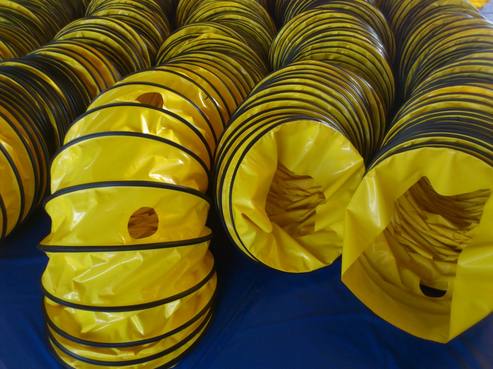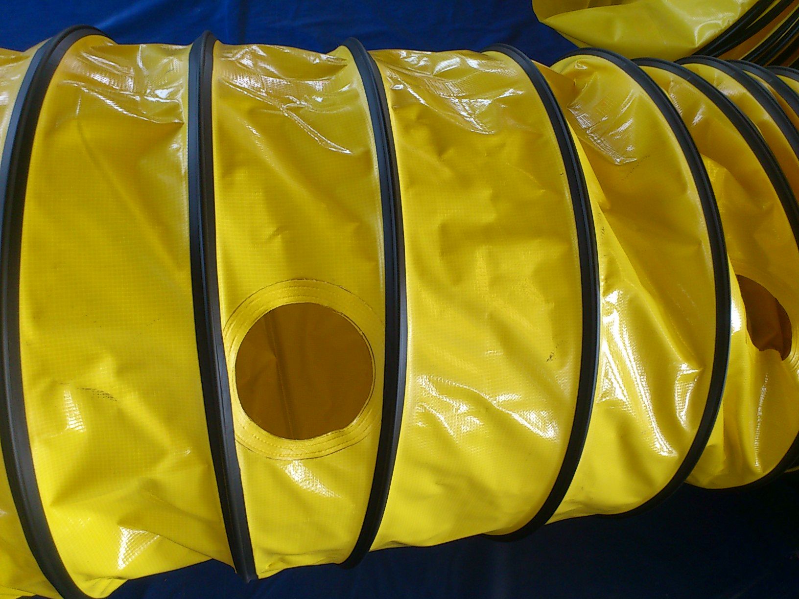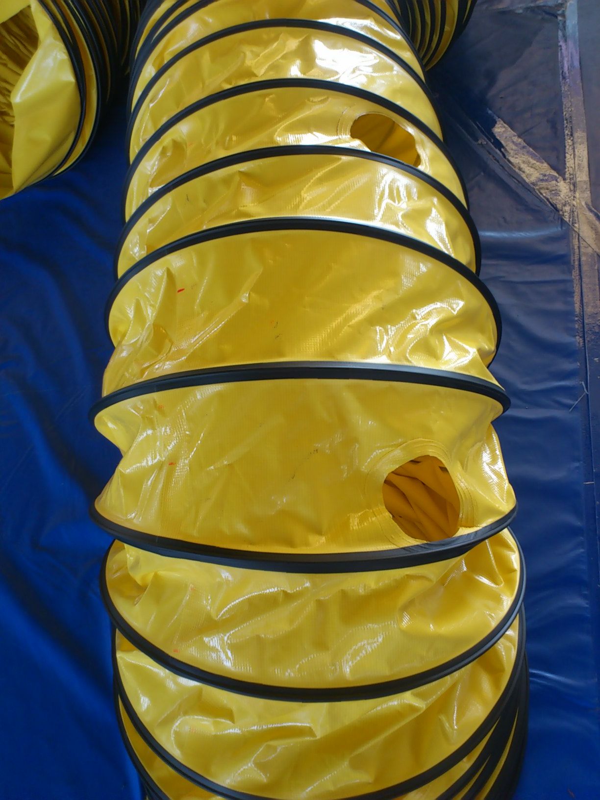 风管主要由三种材料组成,钢线, 阻燃的PVC夹网布, PVC胶条。 用PVC胶条包裹着的钢线作为风管的骨架,风管的管身是PVC夹网布,管身处每隔一米有一个金属吊环,用于固定风管。