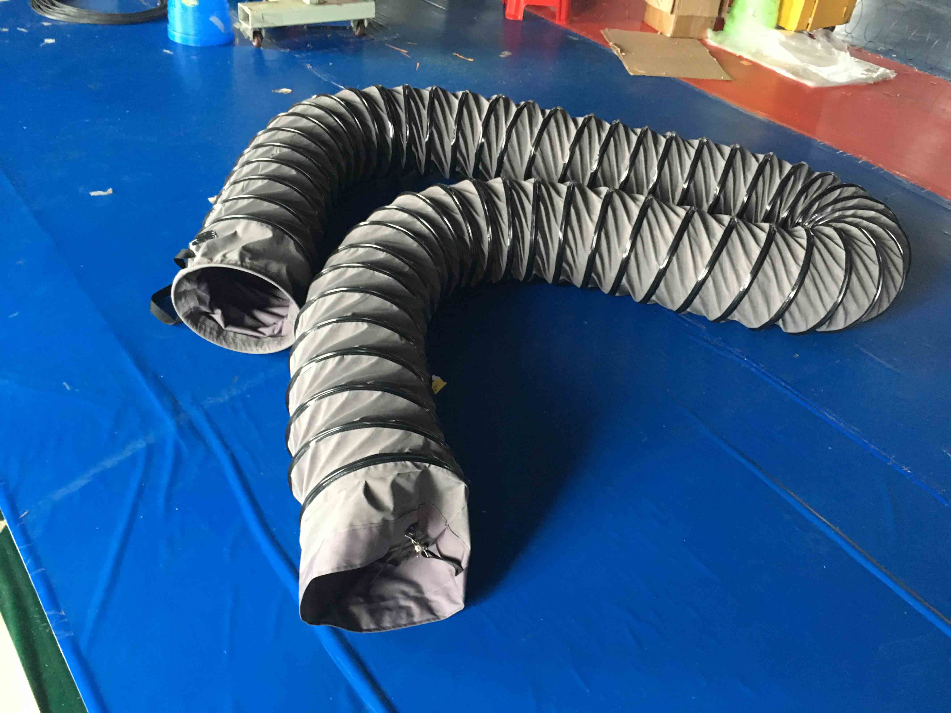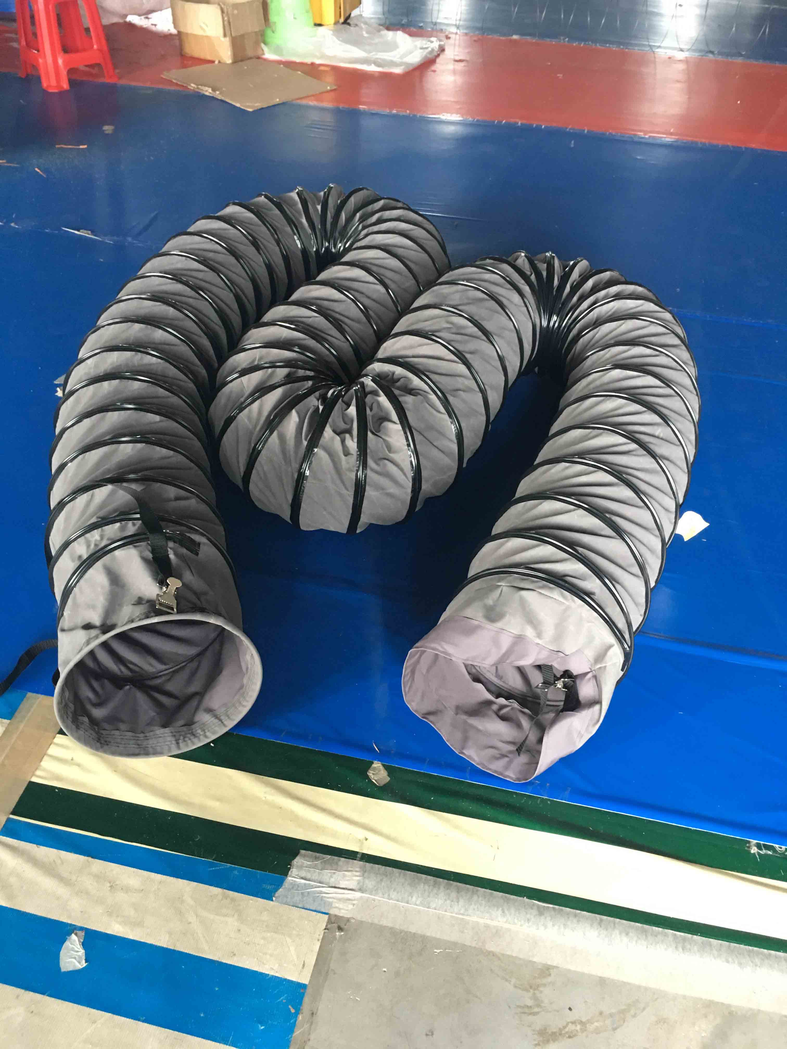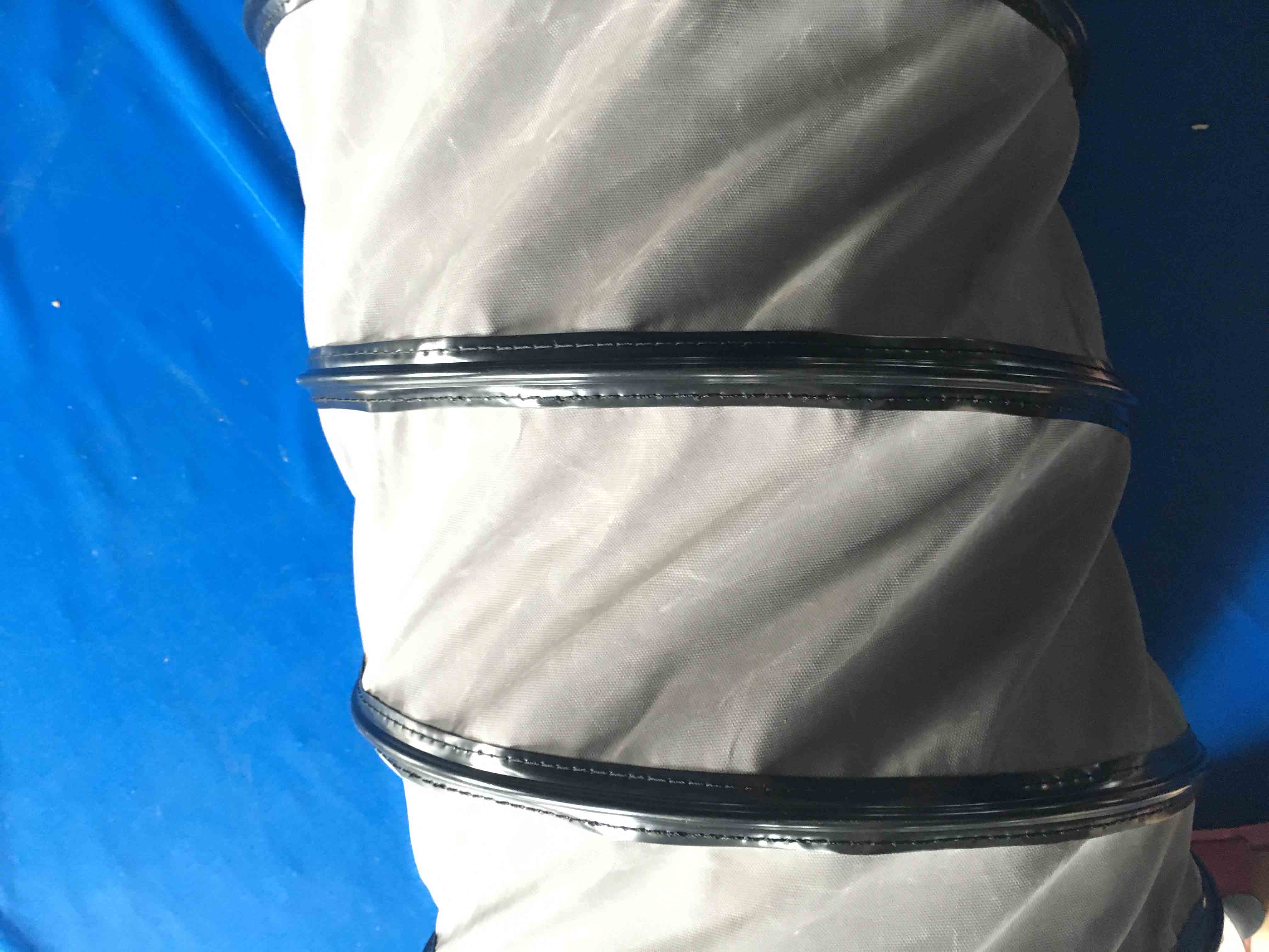 风管主要由三种材料组成,钢线, 阻燃的PVC夹网布, PVC胶条。 用PVC胶条包裹着的钢线作为风管的骨架,风管的管身是PVC夹网布,管身处每隔一米有一个金属吊环,用于固定风管。